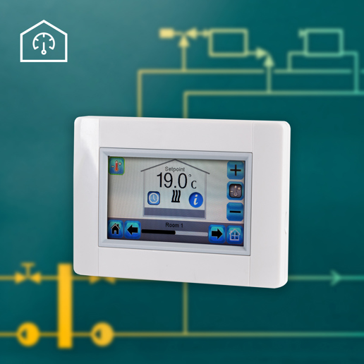 Electronic control and regulation consists of room thermostats and communication modules to control your heating and cooling, see your energy use and status and connect to the internet via wireless or wired communication.