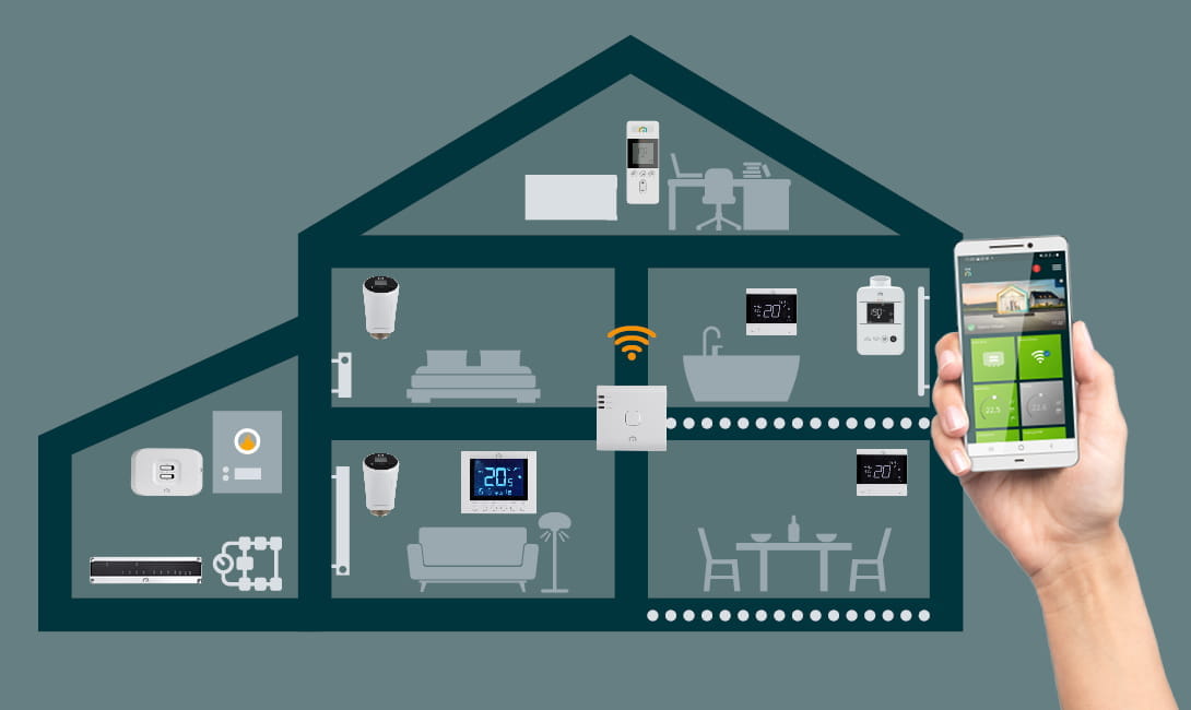 In addition to a comparison between a base control system and a zone control system, our simulation also includes an ETH control system in which each radiator is equipped with an electronic thermostatic head such as the ones that are included in our Unisenza Plus control range. These can easily be connected to the Unisenza Plus Gateway, which in turn can be connected to the user-friendly smartphone app. This allows users to monitor and control all the heat transfer systems linked to the app wherever and whenever they want. The ETHs can, for example, be linked to a thermostat for precise time and temperature zone control and optimal comfort. Moreover, because the electronic thermostatic heads are completely wireless, they are easy to implement in new builds as well as renovation projects to update the existing system.